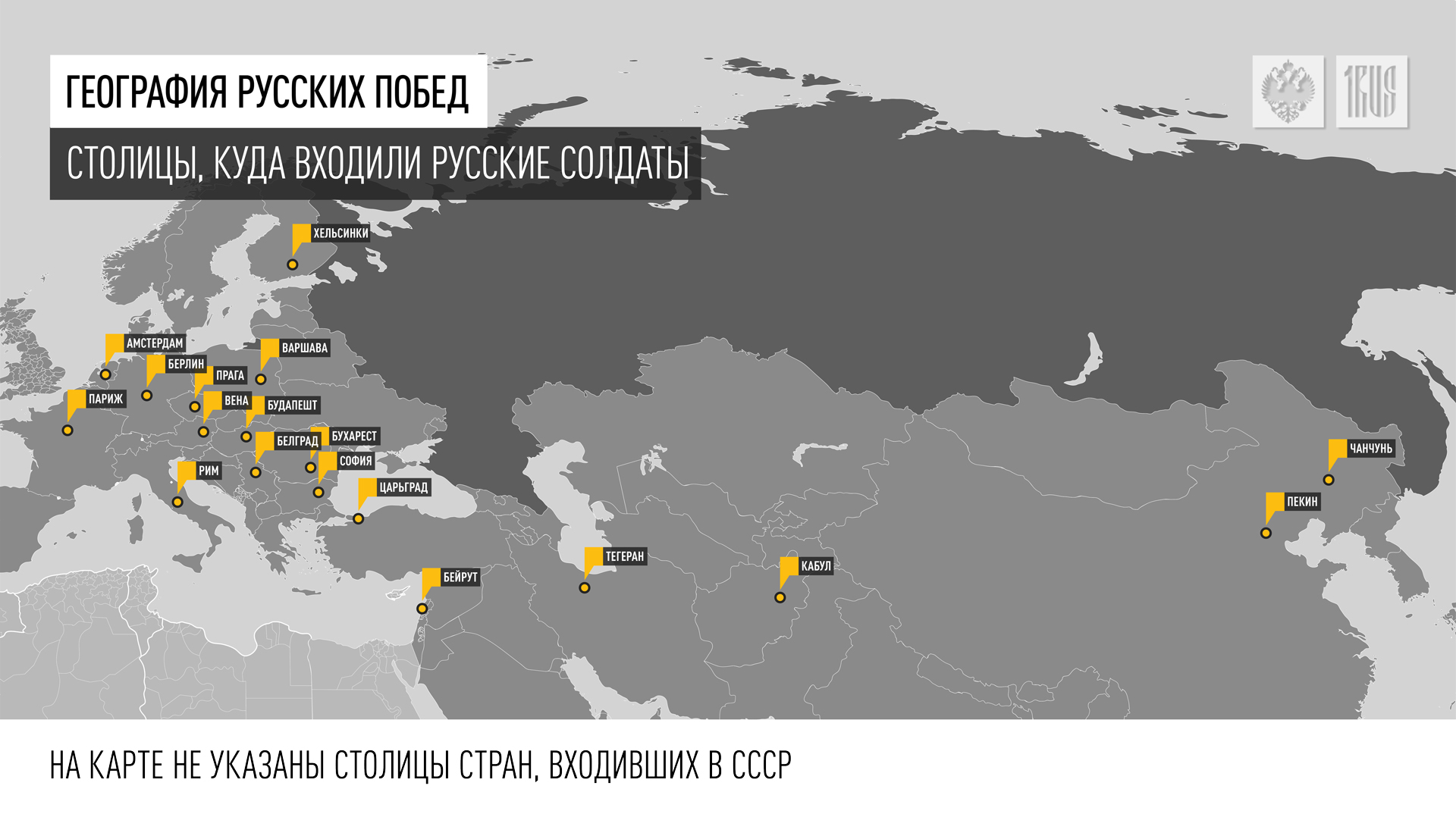 Да что там говорить: русские солдаты отметились за последние 250 лет в большинстве европейских столиц. И не как оккупанты, а как освободители. В 1944–1945 годах наши солдаты побывали в Бухаресте (во второй раз, первый раз – в ходе войны с турками в 1806–1812 годах), Софии (в первый раз её освободили от турок в 1877 году), Белграде, Будапеште, Братиславе (столицей независимого государства она, правда, стала много позже, поэтому на карте мы её не учитываем, как и столицы "государств"), Вене, Праге.